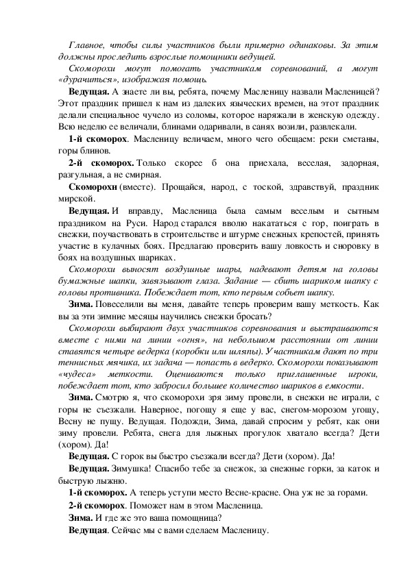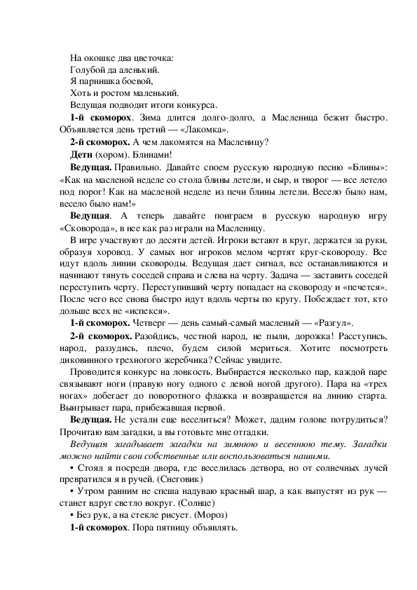 Ведущая. Я вам подскажу, что народ здесь не просто так собрался, а чтоб зиму проводить и весну встретить, веселые русские песни попеть да в игры поиграть.