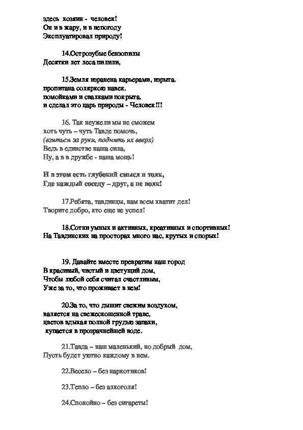 Данная разработка может быть адаптирована под конкретную школу и субъект России и использована на экологических форумах, слетах, конкурсах агитбригад среди учащихся средней и старшей возрастных групп. Материал направлен на формирование у подростков активной жизненной позиции и неравнодушного отношения к природе малой родины.