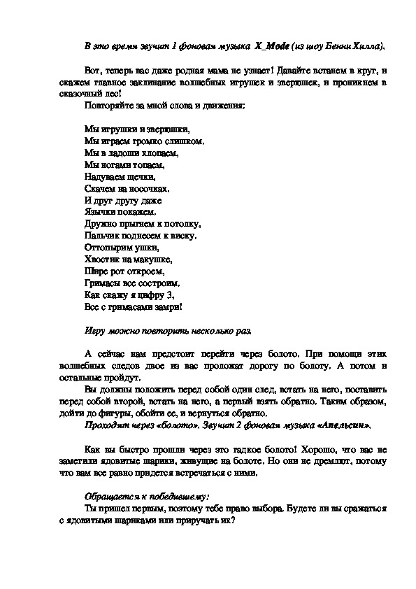 Ребята надевают костюмы игрушек и зверюшек или рисуется.В это время звучит 1 фоновая музыка X_Mode (из шоу Бенни Хилла).