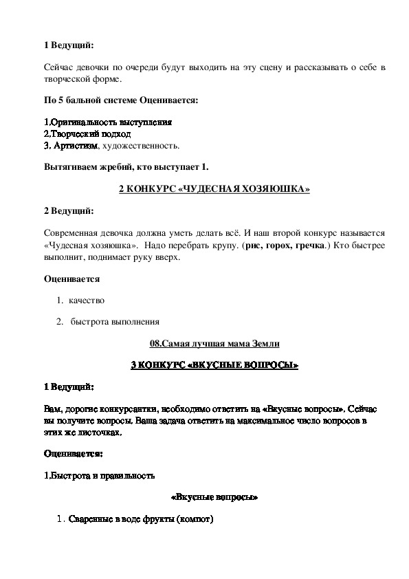 В данном сценарии содержатся материалы конкурсной программы, посвящённого Международному Дню 8 марта. Сценарий состоит из 2-х частей: праздничной и конкурсной. В первой части-праздничной, звучат добрые слова в адрес всех женщин, девочек, бабушек и концертные номера. Во второй части девочки демонстрируют свои умения, обаяние, артистизм в различных конкурсах.