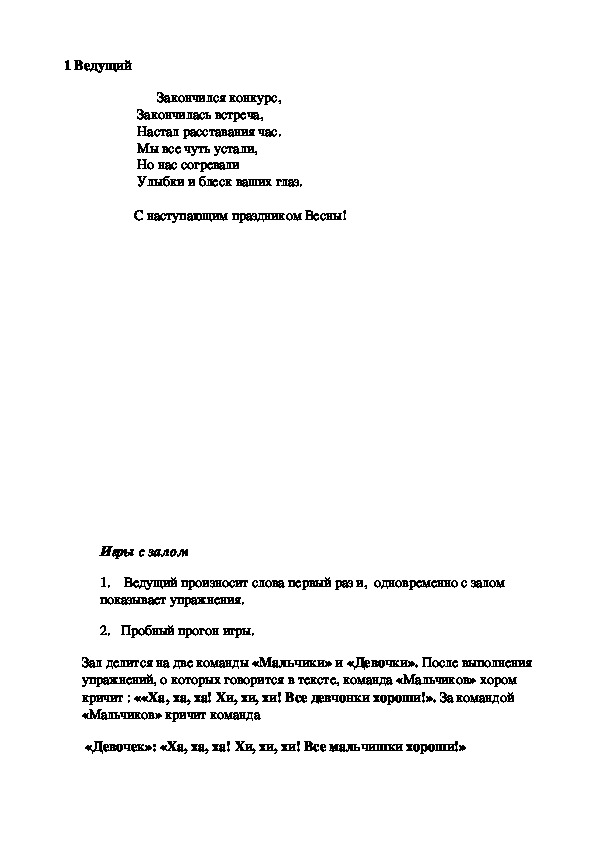 «Девочек»: «Ха, ха, ха! Хи, хи, хи! Все мальчишки хороши!»3. Игра. Ведущий произносит слова разминки и делает упражнения вместе с