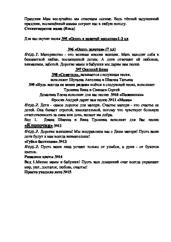 Сценарий концерта, посвящённого Дню матери «Добру пусть