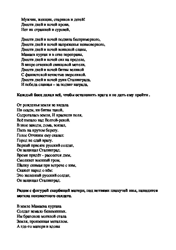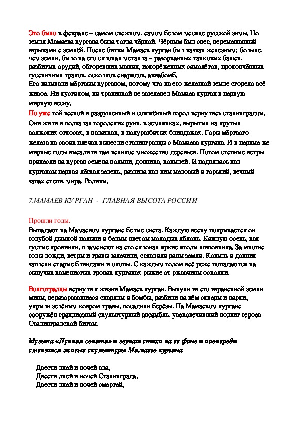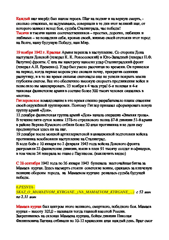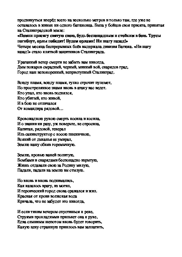 Сценарий внеклассного мероприятия посвящён великой победе в Сталинградской битве. В сценарий включены основные моменты Сталинградской битвы, видео-материалы, военные хроники, стихотворения, посвященные этой битве, итоги битвы. В наше время пытаются переделать историю, умолить заслуги наших отцов и дедов. И только от нас зависит, сохраним ли мы память для наших детей о тех уже далеких событиях