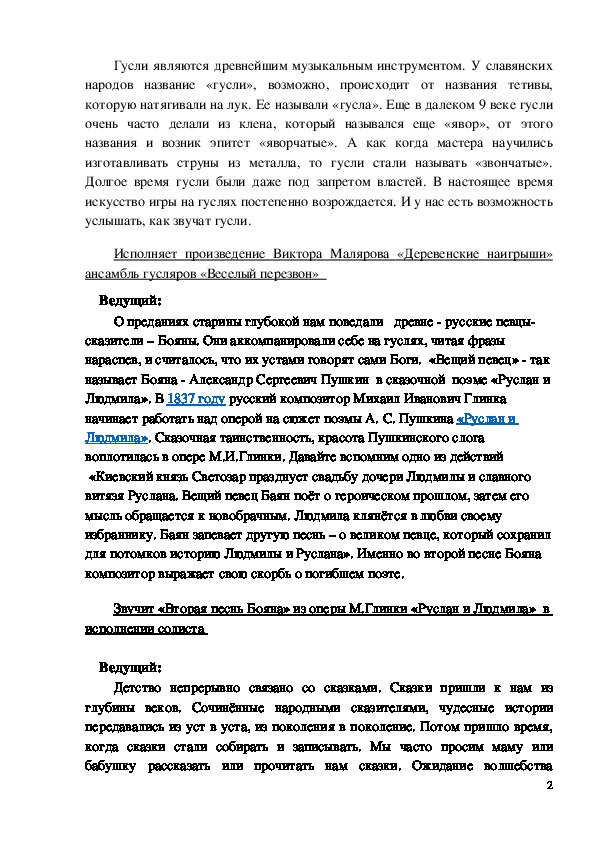 Гусли являются древнейшим музыкальным инструментом. У славянских народов название «гусли», возможно, происходит от названия тетивы, которую натягивали на лук. Ее называли «гусла». Еще в далеком 9 веке гусли очень часто делали из клена, который назывался еще «явор», от этого названия и возник эпитет «яворчатые». А как когда мастера научились изготавливать струны из металла, то гусли стали называть «звончатые». Долгое время гусли были даже под запретом властей. В настоящее время искусство игры на гуслях постепенно возрождается. И у нас есть возможность услышать, как звучат гусли.программа