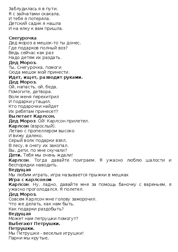 Золушка, Красная шапочка, Карлсон, Петрушки, Сыщики.