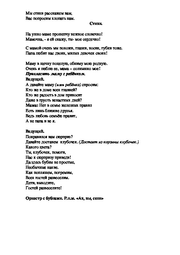 Сценарий праздника "8 марта- мамин день" для детей младшего дошкольного возраста предполагает активное участие не только детей, но и родителей. Вовлечение родителей в изготовление необходимых атрибутов к празднику дает возможность педагогам приобщить их к жизни детского сада и вовлечь их в совместную деятельность с детьми.Сценарий праздника для детей младшего дошкольного возраста
