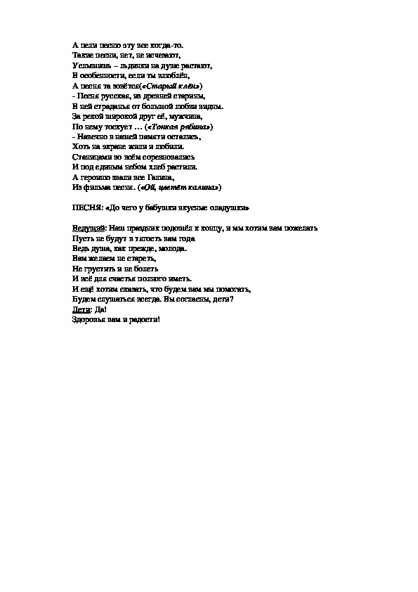 Ведущий: А сейчас предлагаем бабушкам отгадать и спеть их любимые песни.А пели песню эту все когдато.
