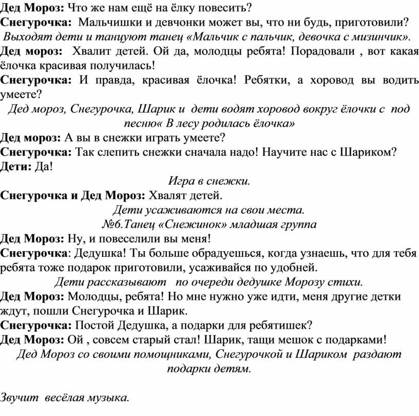 Здравствуйте, гости дорогая! Здравствуйте мальчишки и девчонки! Меня зовут Снегурочкой! Ребята, а вы знаете, какой праздник скоро придёт? В Новый год все получают подарки, раздаётся много смеха и никто не плачет! В новый год звучит весёлая музыка и песни. В вы петь умеете? Может быть, вы про Ёлочку песню споёте?