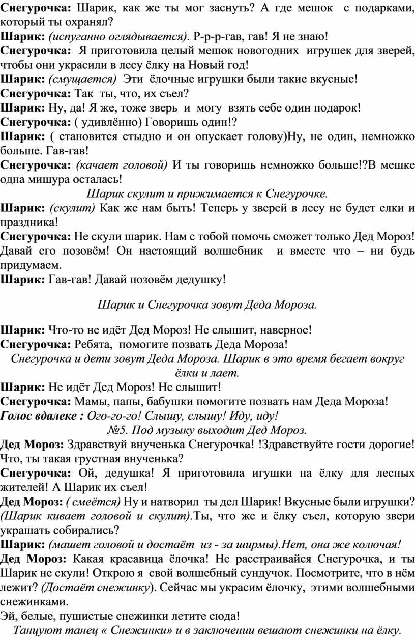 Дед Мороз: ( смеётся) Ну и натворил ты дел Шарик! Вкусные были игрушки? (Шарик кивает головой и скулит).Ты, что же и ёлку съел, которую звери украшать собирались?