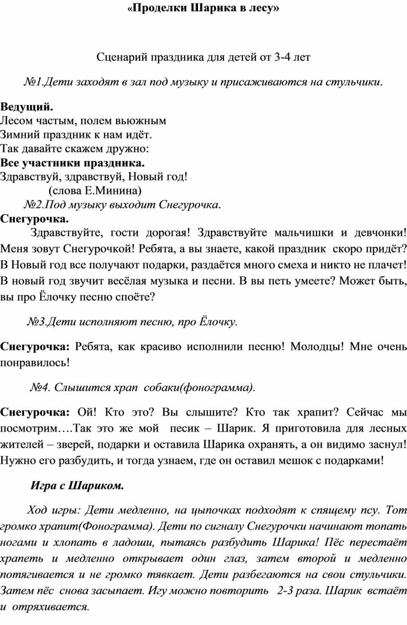 Снегурочка: Ой! Кто это? Вы слышите? Кто так храпит? Сейчас мы посмотрим….Так это же мой песик – Шарик. Я приготовила для лесных жителей – зверей, подарки и оставила Шарика охранять, а он видимо заснул! Нужно его разбудить, и тогда узнаем, где он оставил мешок с подарками!