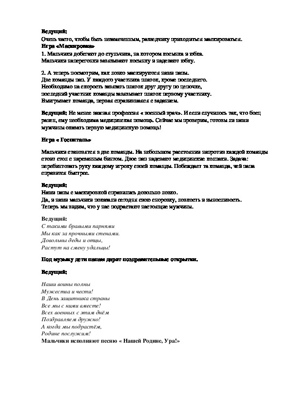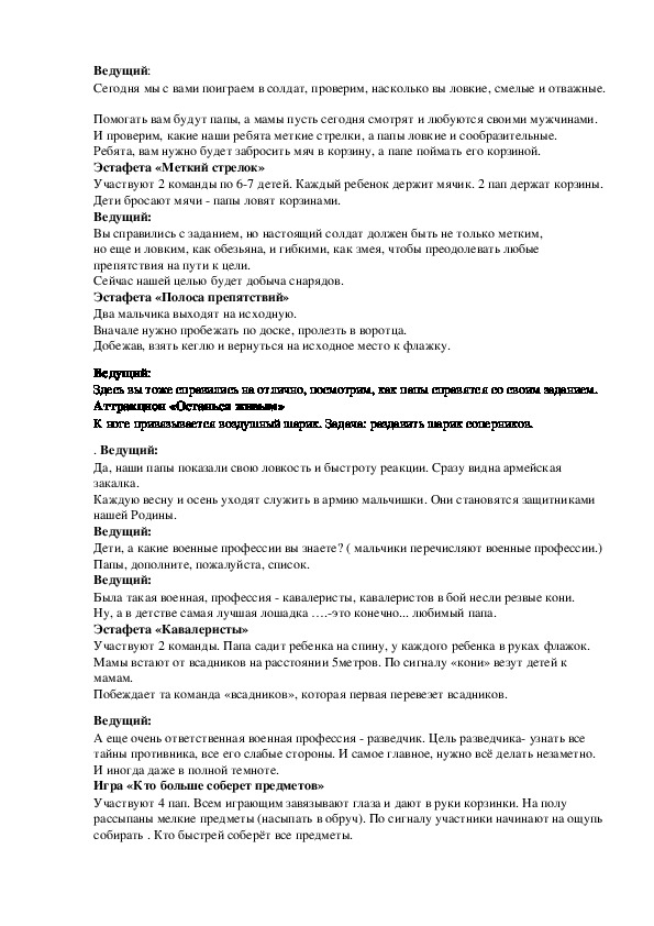 Организация праздника способствует гармонизации детско - родительских отношений. В сценарии используются стихи посвященные Дню защитника отечества, песни той же тематики. Различные эстафеты, соревнования, аттракционы. В празднике участвуют папы, тесно взаимодействуют с детьми. Дети закрепляют знания о военных профессиях, о военной технике.Праздник посвященный Дню защитника отечества " Наша армия сильна!"
