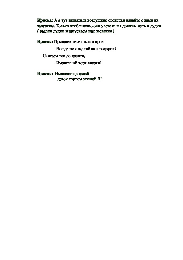 Ириска: А я тут захватила воздушные огонечки давайте с вами их запустим. Только чтоб высоко они улетели вы должны дуть в дудки ( раздаю дудки и запускаем шар желаний )
