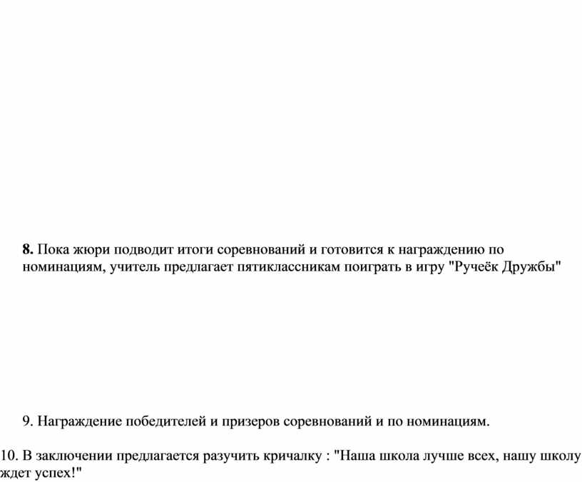 8. Пока жюри подводит итоги соревнований и готовится к награждению по номинациям, учитель предлагает пятиклассникам поиграть в игру "Ручеёк Дружбы"
