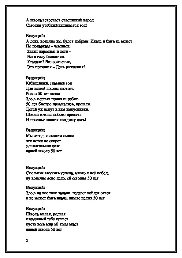 СЦЕНАРИЙ Торжественной линейки 1 сентября «А вот и первый звонок...» Нашей школе 50 лет, и ребята старшеклассники решили связать этот праздник,чтоб поздравить свою школу. В сценарии были задействованы первоклассники, сказочный герой (школа приобрела ростовую куклу),старшеклассники. Нас пришли поздравить гости с такой прекрасной датой.
