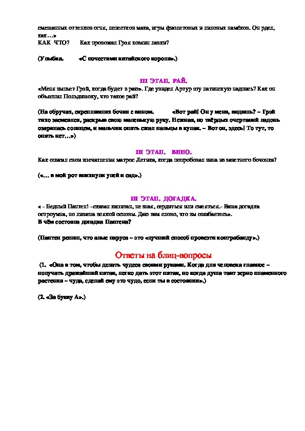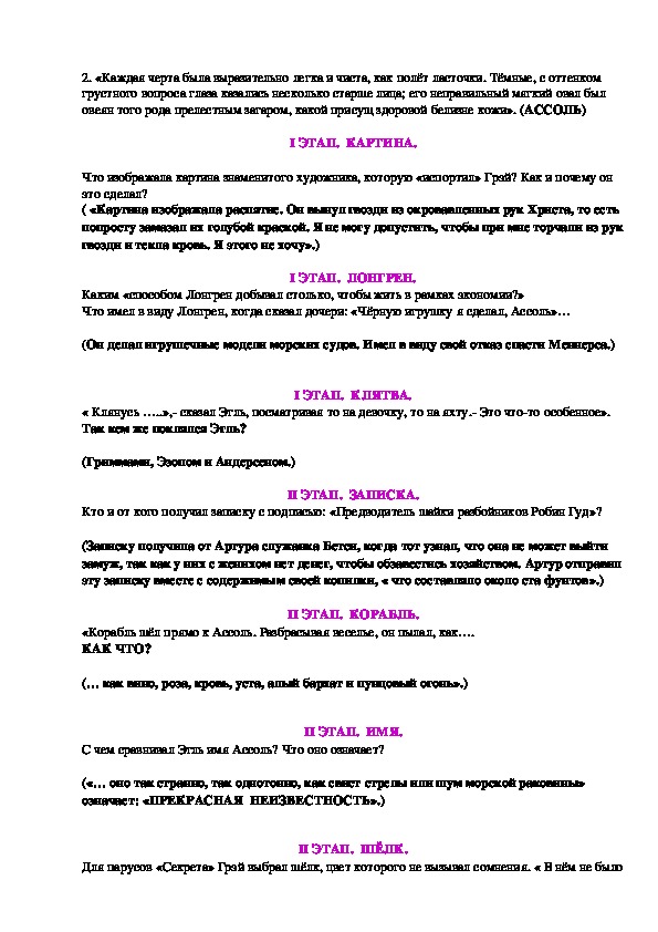 Наше путешествие будет проходить в форме телевизионной игры «Умники и умницы», оценивать знания участников предстоит настоящим капитанам «книжных морей»: Сегодня мы отправимся в путешествие по страницам книги, которую смело можно отнести к современной классике. И в новом веке старый секрет этой книги открывается в яркости и романтической силе мечты и «остаётся навсегда в алом отблеске парусов, созданных глубиной сердца, знающего, что такое любовь». Как напутствие пусть прозвучат для вас слова писателя Даниила Гранина:Сценарий "Умники и умницы" 8 класс