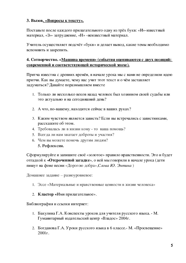 5. «Рефлексия». Обучающиеся отвечают на вопросы, осмысливая идею притчи и