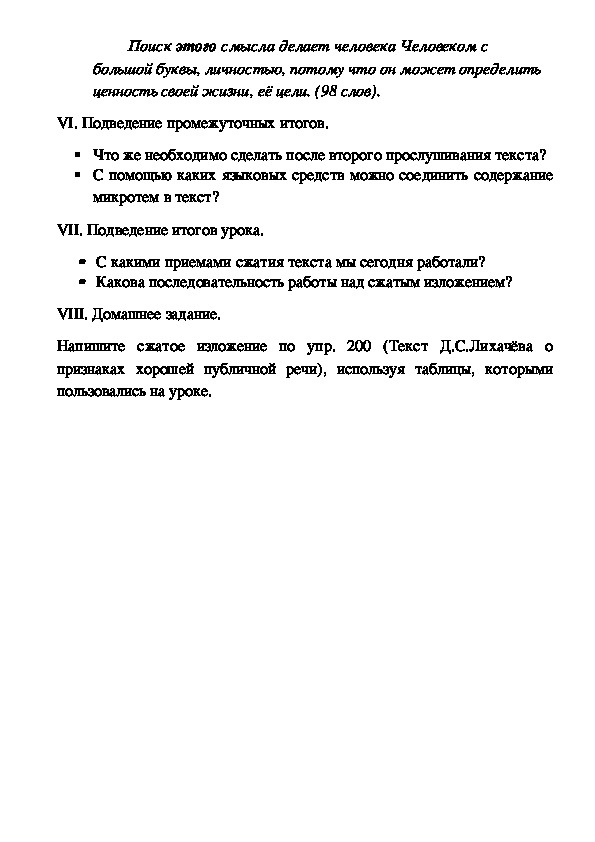 Напишите сжатое изложение по упр. 200 (Текст Д.С.Лихачёва о