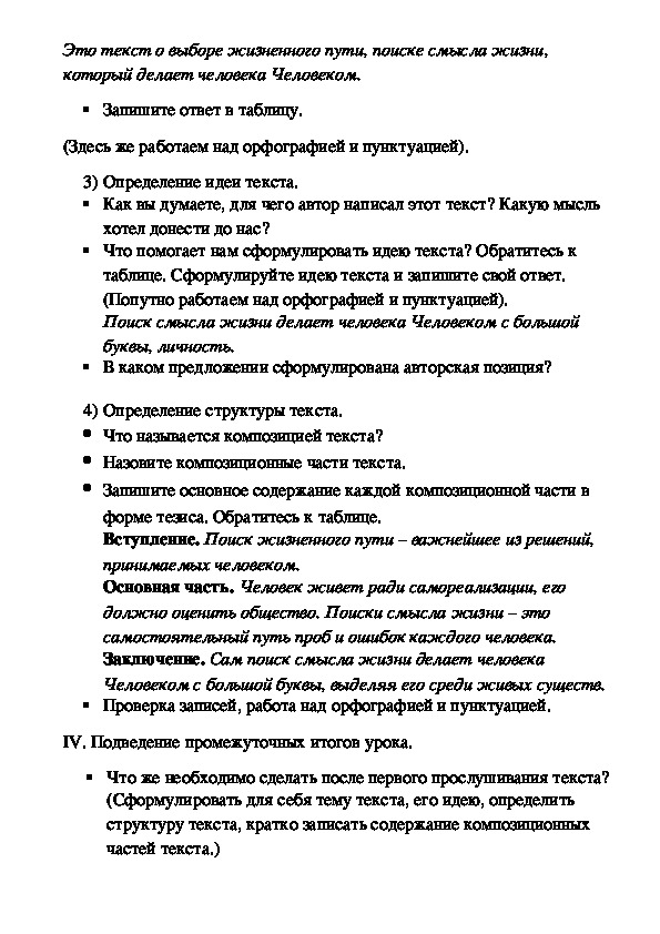 III. Работа с текстом. (Используем таблицу для обучения школьников