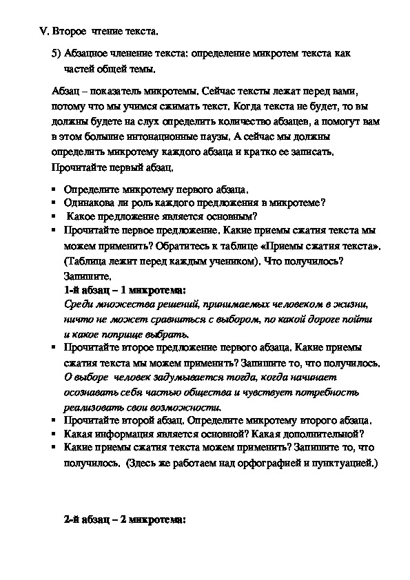 частей текста.)V. Второе чтение текста.