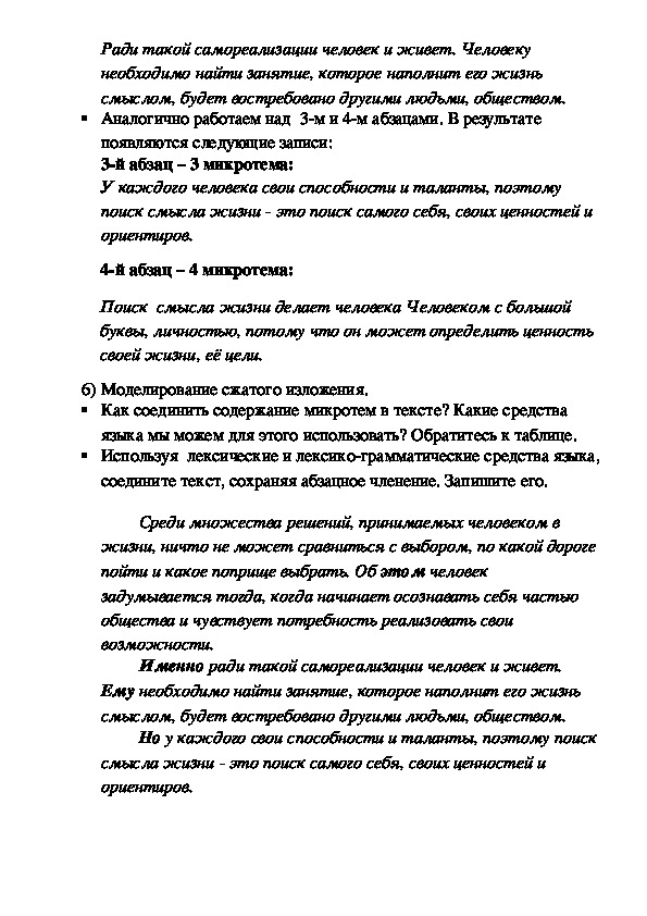 2й абзац – 2 микротема:Ради такой самореализации человек и живет. Человеку