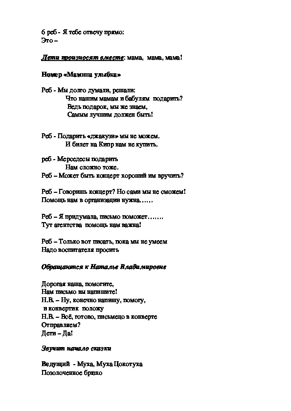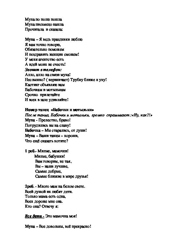 Уважаемые коллеги, предлагаю вам сценарий утренника, посвящённого женскому празднику 8 марта. Я целенаправленно не стала указывать возрастную категорию детей, так как в сценарий внесла авторский вариант миниатюры по мотивам «Мухи Цокотухи». И от того кто будет играть роль Мухи (ребёнок или взрослый) зависит какой группе он подходит. Например, в моём случае, муху будет играть девочка, выпускница театрального коллектива нашего города, поэтому , этот сценарий я использую в средней группе.