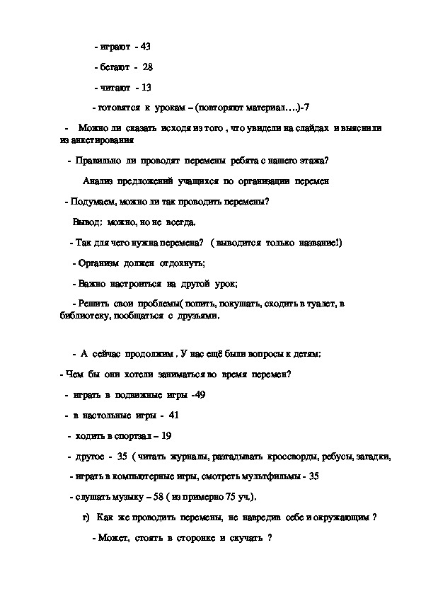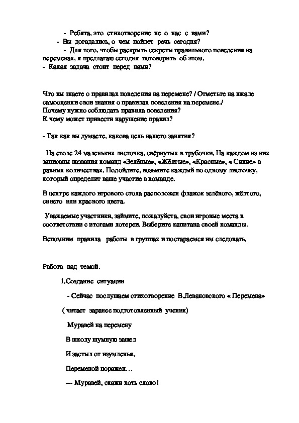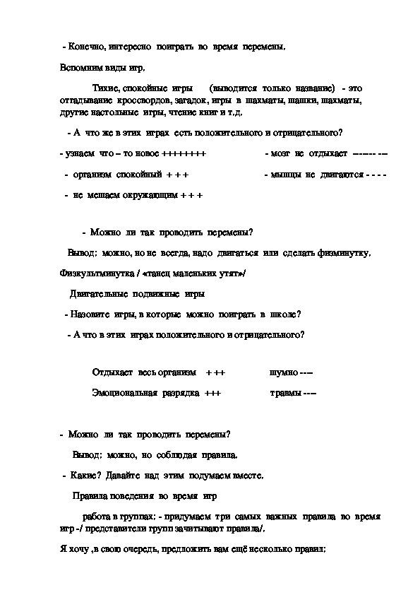 Дети работают в группах.На мероприятии они самостоятельно определяют тему,цель, разрабатывают правила поведения на перемене, работают со шкалой самооценки,представляют результаты анкетирования,проведенного среди обучающихся второй смены.Ученики доказывают положительные и отрицательные стороны как подвижных,так и спокойных игр.В процессе работы ,ученики понимают необходимость выполнять соответствующие правила поведения на перемене.