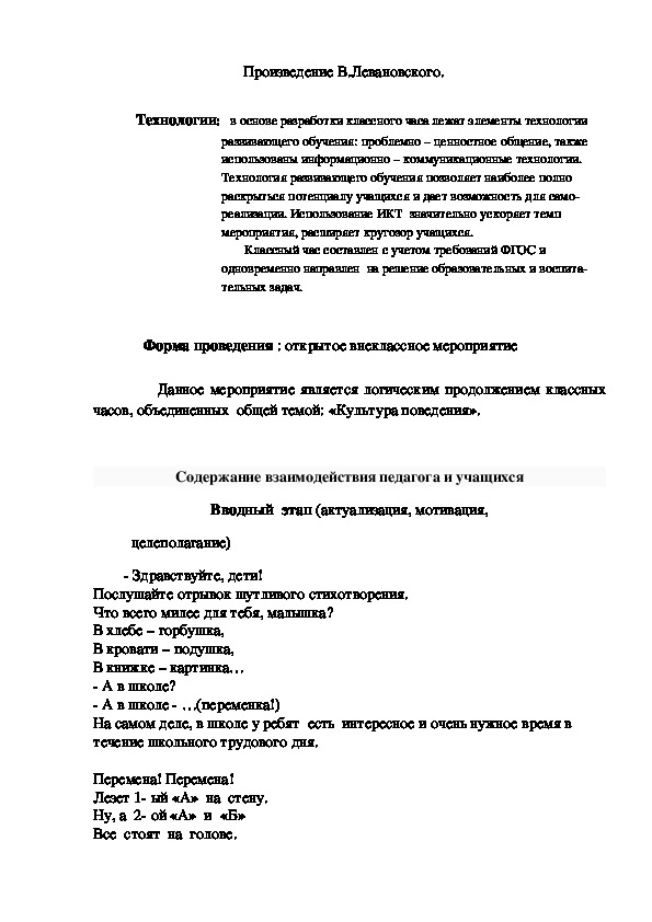 Технологическая карта воспитательного мероприятия «Я на перемене».