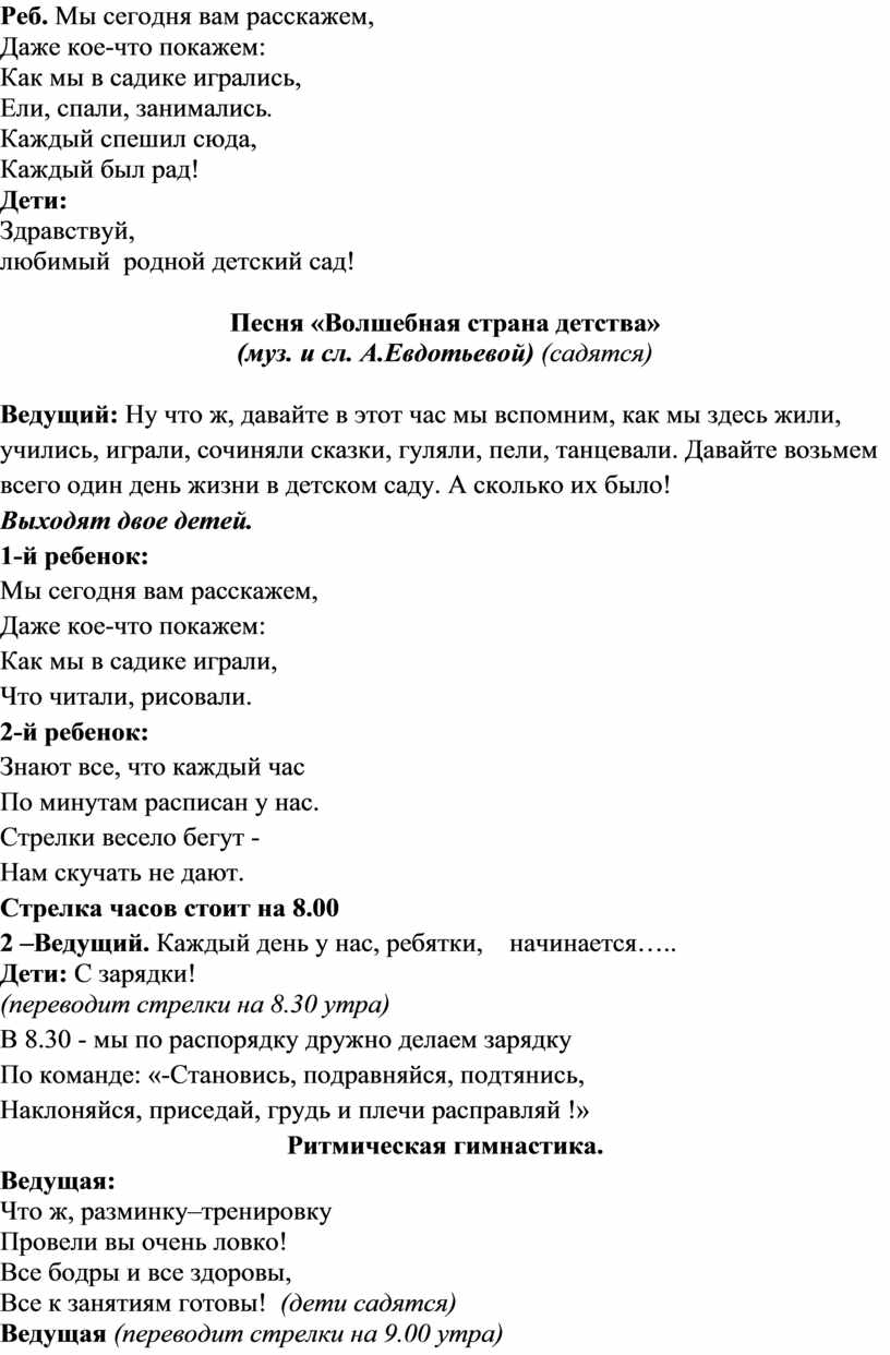 Ведущий: Ну что ж, давайте в этот час мы вспомним, как мы здесь жили, учились, играли, сочиняли сказки, гуляли, пели, танцевали. Давайте возьмем всего один день жизни в детском саду. А сколько их было!