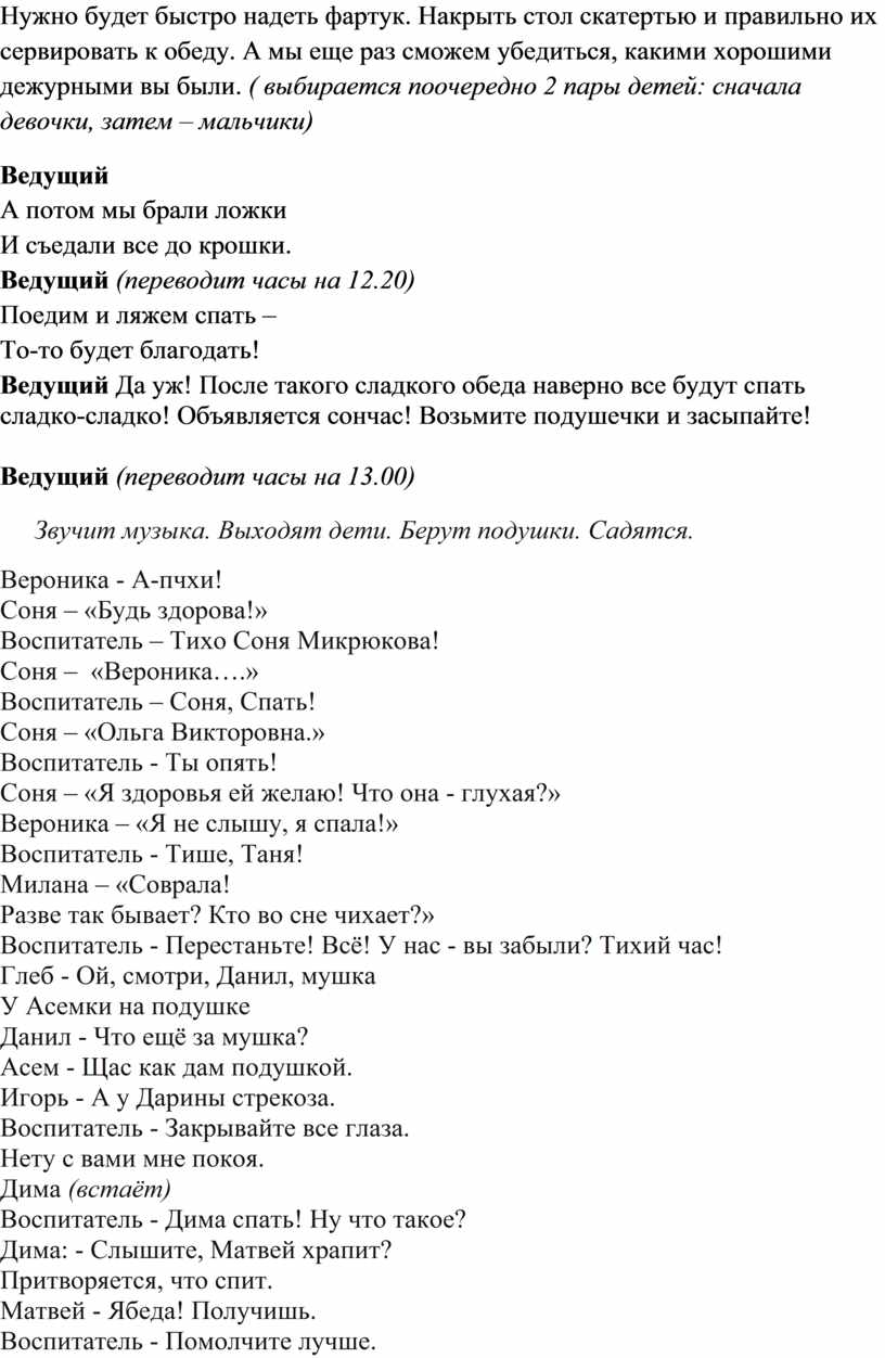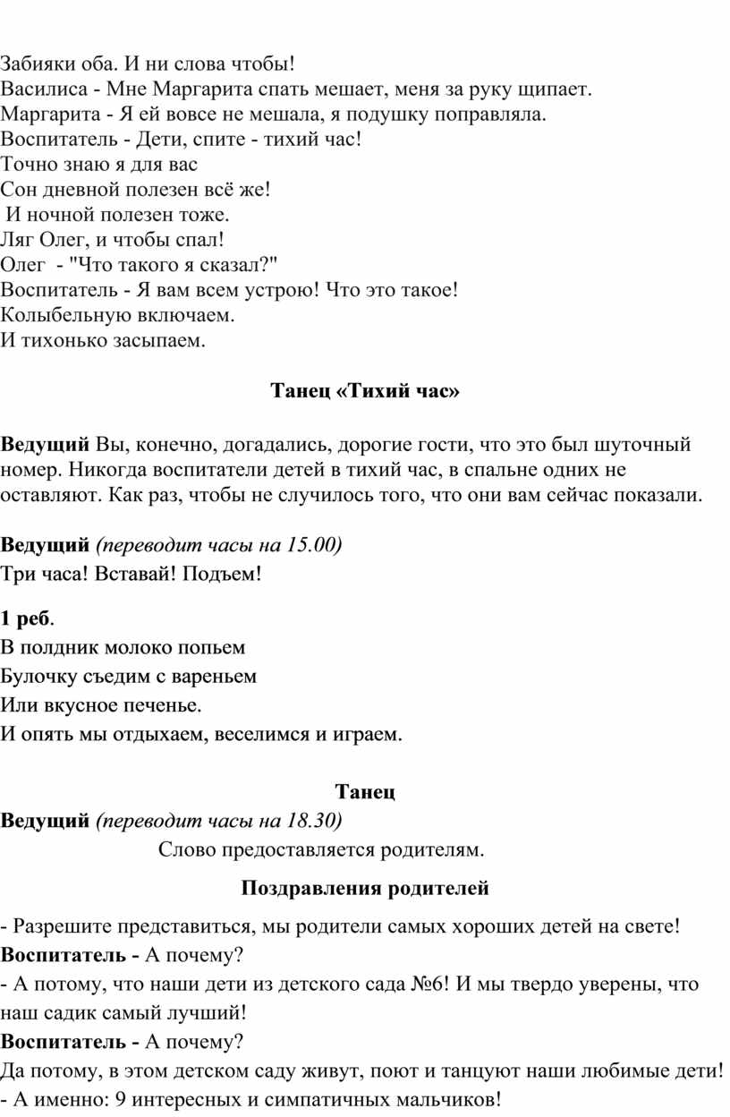Ведущий Вы, конечно, догадались, дорогие гости, что это был шуточный номер. Никогда воспитатели детей в тихий час, в спальне одних не оставляют. Как раз, чтобы не случилось того, что они вам сейчас показали.