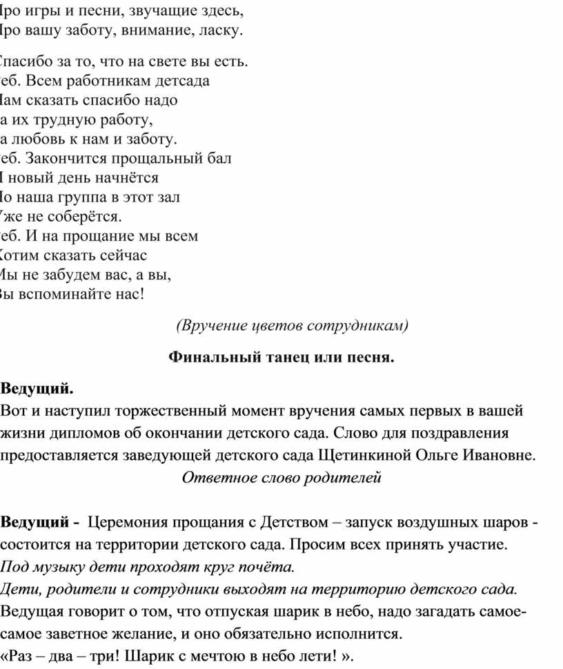 Ведущий - Церемония прощания с Детством – запуск воздушных шаров - состоится на территории детского сада. Просим всех принять участие.
