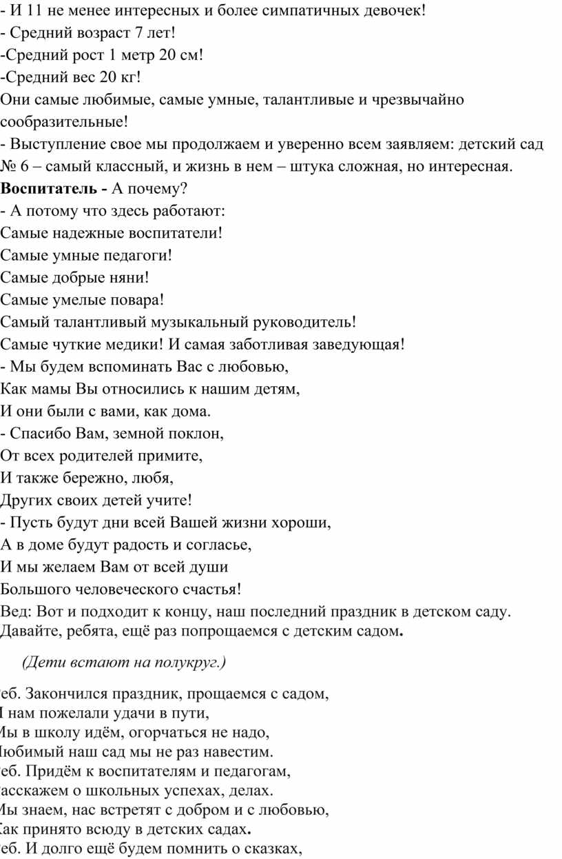 Вед: Вот и подходит к концу, наш последний праздник в детском саду. Давайте, ребята, ещё раз попрощаемся с детским садом.