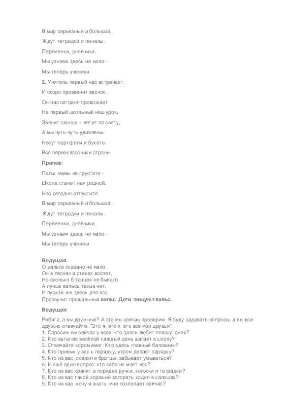 Дети: Нет!Дорогие гости! Сегодня наши выпускники, торжественные и взволнованные, спешат на первый в своей жизни выпускной бал. Сегодня вас ждет необычайно волнующее торжество! Наши дети прощаются с предшколой и готовятся к новому жизненному этапу – поступлению в 1 класс. Так хочется, чтобы этот день запомнился надолго и ребятам, и взрослым. Итак, всё готово к празднику. Встречайте наших выпускников! (объявляет в микрофон фамилии и имена выпускников): Дети входят под музыку «Чему учат в школе» И делают круг почёта