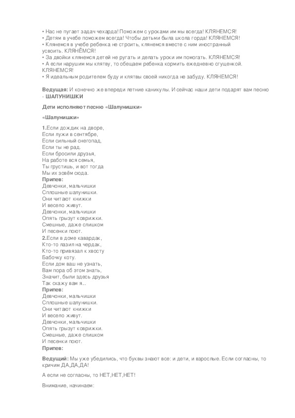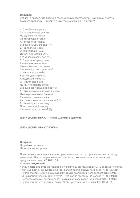 Учитель: А теперь, дети, для вас выступают ваши родители. Посмотрите как