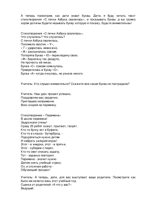 Учитель:А теперь посмотрим, как дети знают буквы. Дети, я буду читать текст