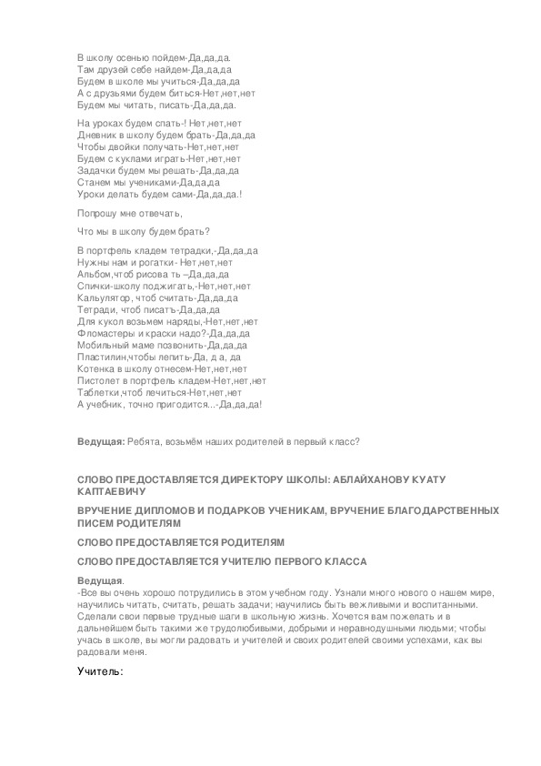 Ведущая: Ребята, возьмём наших родителей в первый класс?