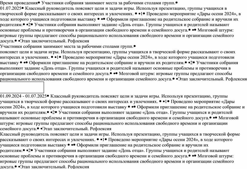 Участники собрания выполняют задание «День отца». Группы учащихся и родителей называют основные проблемы и противоречия в организации свободного времени и семейного досуга. |