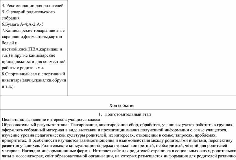 1. Подготовительный этап Цель этапа: выявление интересов учащихся класса Образовательный результат этапа: Тестирование, анкетирование-сбор, обработка, учащиеся учатся работать в группах, оформлять собранный материал в виде выставки и презентации анализ полученной информации о семье учащегося, изучение уровня педагогической культуры родителей, их интересах, отношений в семье, запросах, проблемах, приоритетах. В особенности изучаются взаимоотношения и взаимодействия между родителями и детьми, перспективу развития учащихся. Родительские консультации-содержат только конкретный, необходимый, чёткий для родителей материал. Наглядно-информационные формы: Интернет сайт для родителей-страничка в социальных сетях, родительские чаты в мессенджерах, сайт образовательной организации, на которых размещается информация для родителей различного уровня, связанная с воспитательной работой школы или процесса обучения Брошюры, буклеты, памятки для родителей по взаимодействию семьи и школы. |