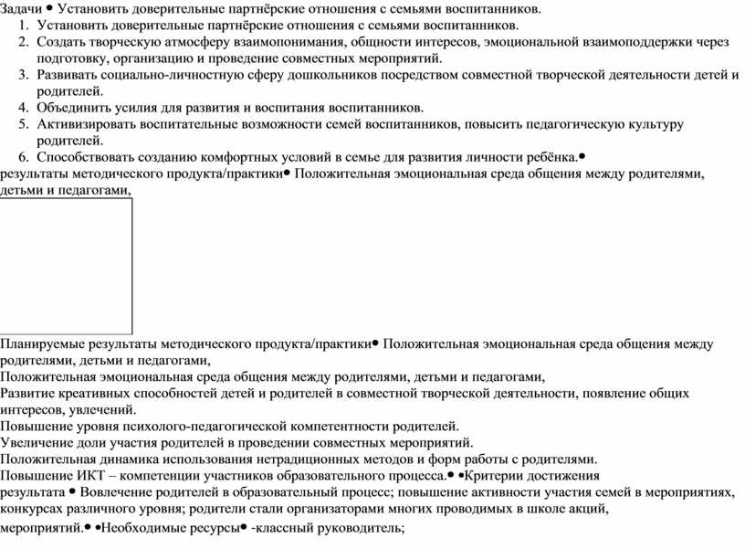 1. Установить доверительные партнёрские отношения с семьями воспитанников. 2. Создать творческую атмосферу взаимопонимания, общности интересов, эмоциональной взаимоподдержки через подготовку, организацию и проведение совместных мероприятий. 3. Развивать социально-личностную сферу дошкольников посредством совместной творческой деятельности детей и родителей. 4. Объединить усилия для развития и воспитания воспитанников. 5. Активизировать воспитательные возможности семей воспитанников, повысить педагогическую культуру родителей. 6. Способствовать созданию комфортных условий в семье для развития личности ребёнка. |