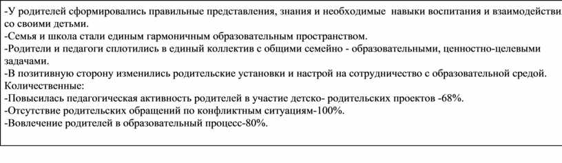 Вовлечение родителей в образовательный процесс; повышение активности участия семей в мероприятиях, конкурсах различного уровня; родители стали организаторами многих проводимых в школе акций, мероприятий. |