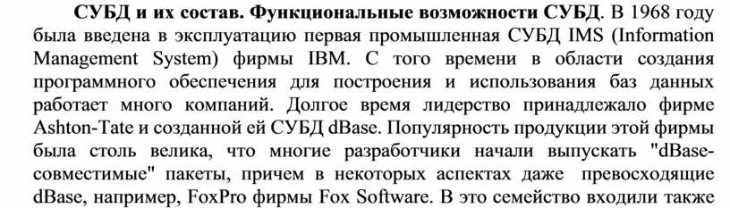 СУБД и их состав. Функциональные возможности СУБД. В 1968 году была введена в эксплуатацию первая промышленная СУБД IMS (Information Management System) фирмы IBM. С того времени в области создания программного обеспечения для построения и использования баз данных работает много компаний. Долгое время лидерство принадлежало фирме Ashton-Tate и созданной ей СУБД dBase. Популярность продукции этой фирмы была столь велика, что многие разработчики начали выпускать "dBase- совместимые" пакеты, причем в некоторых аспектах даже превосходящие dBase, например, FoxPro фирмы Fox Software. В это семейство входили также