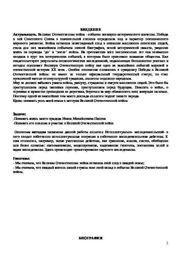 Актуальность. Великая Отечественная война - событие всемирно-исторического значения. Победа в ней Советского Союза в значительной степени определила ход и характер послевоенного мирового развития. Война оставила неизгладимый след в сознании миллионов советских людей, стала для них важнейшим событием личной биографии, вехой исторической памяти, разделив жизнь на периоды "до" и "после" войны. На протяжении всех послевоенных лет она неизменно входила в круг тех исторических событий, к которым было приковано внимание общества. Как свидетельствуют результаты социологических исследований, подавляющее большинство россиян и сегодня оценивает Великую Отечественную войну как одно из важнейших событий мировой и отечественной истории XX века . Особое отношение сложилось к празднику Победы в Великой Отечественной войны: он имеет не только официальный государственный статус, но стал органичной ча-стью этнокультурной традиции, является подлинно народным.