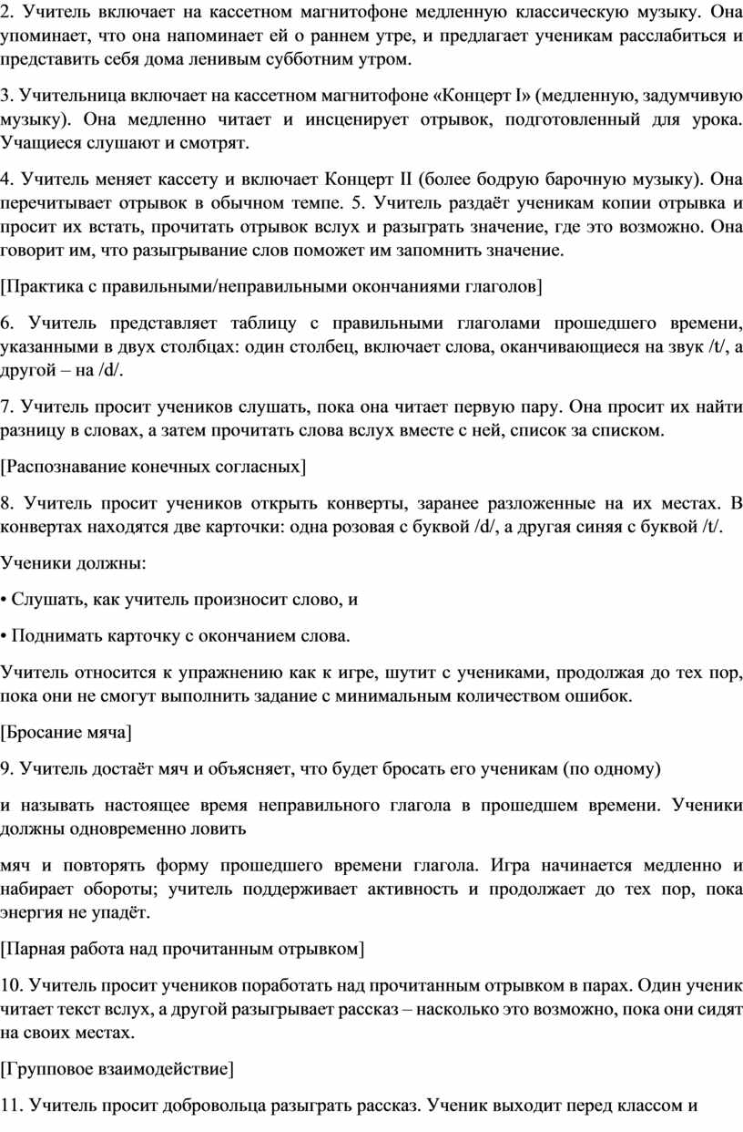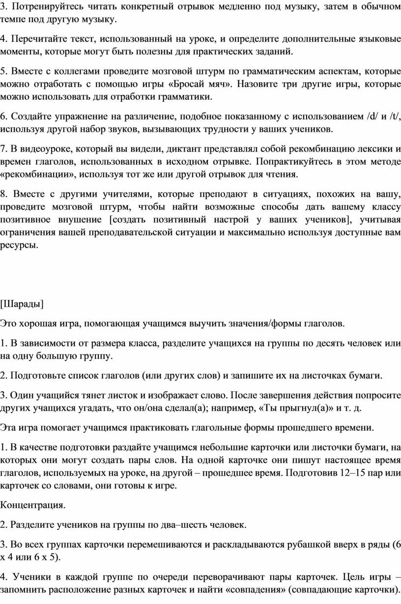 мяч и повторять форму прошедшего времени глагола. Игра начинается медленно и набирает обороты; учитель поддерживает активность и продолжает до тех пор, пока энергия не упадёт.