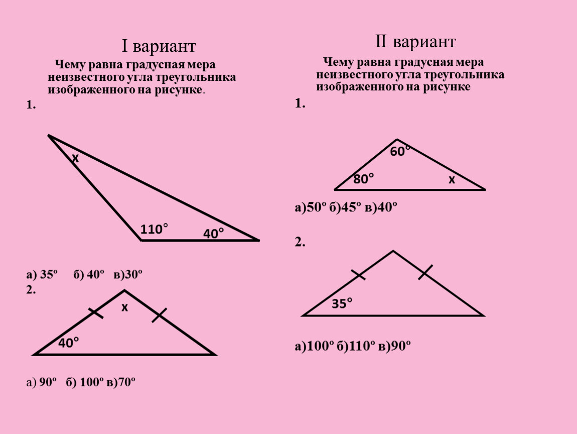 Чему равна градусная мера неизвестного угла треугольника изображенного на рисунке