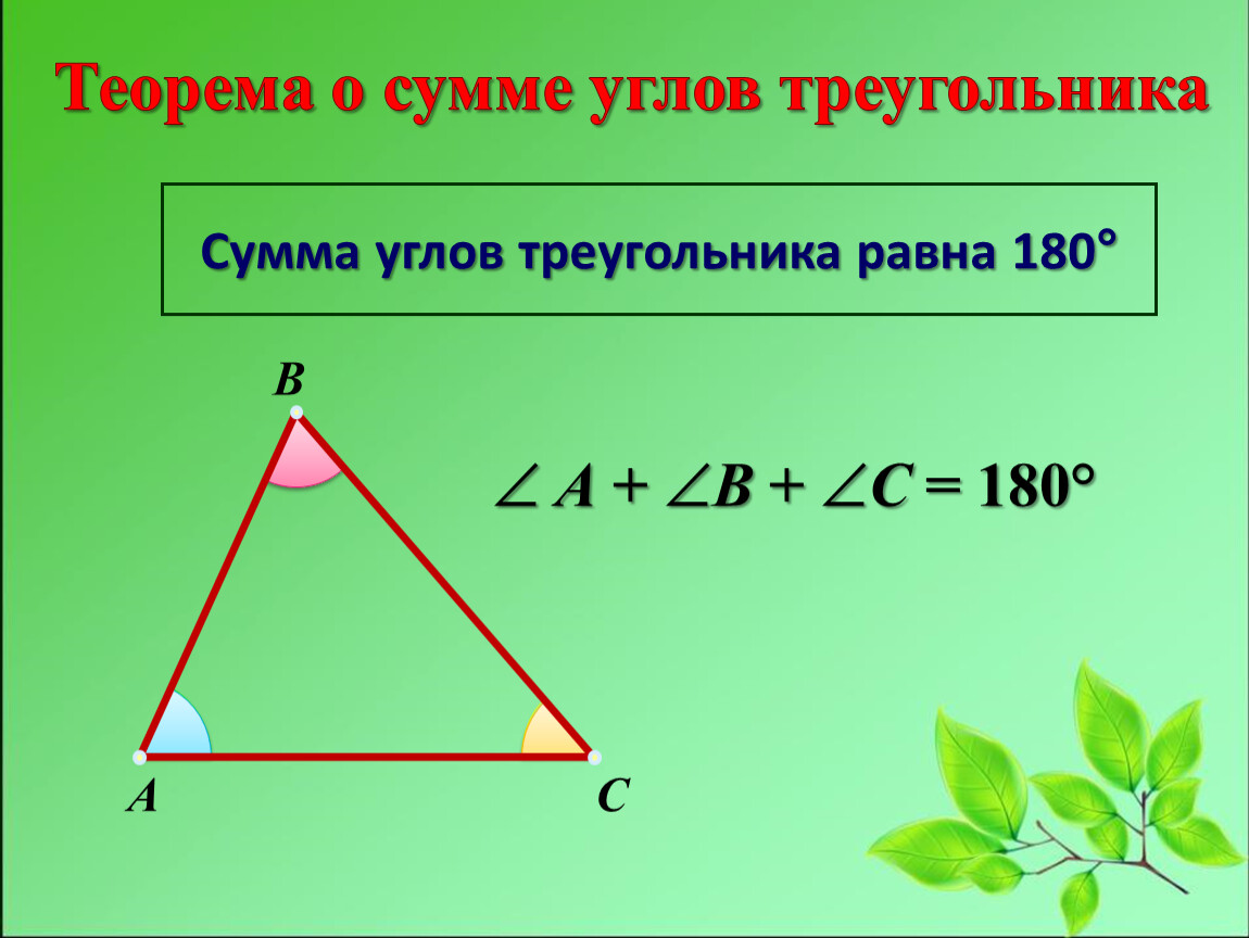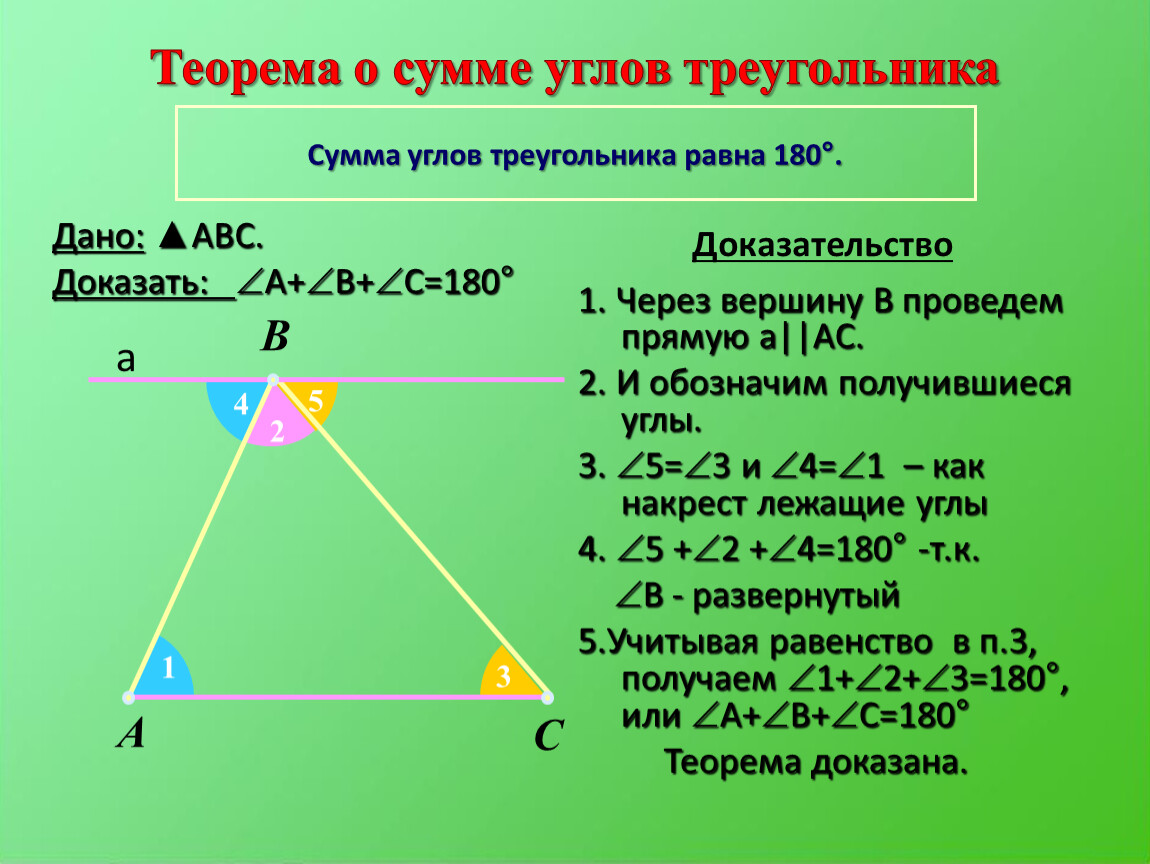 5.Учитывая равенство в п.3, получаем 1+2+3=180°, или А+В+С=180°
