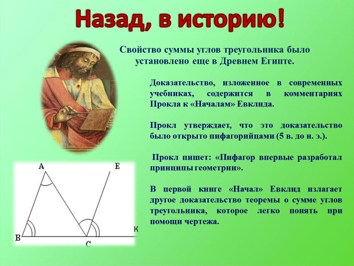 Свойство суммы углов треугольника было установлено еще в Древнем Египте.
