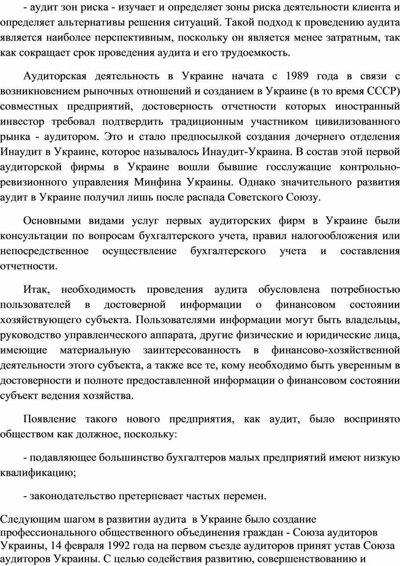 Основными видами услуг первых аудиторских фирм в Украине были консультации по вопросам бухгалтерского учета, правил налогообложения или непосредственное осуществление бухгалтерского учета и составления отчетности.