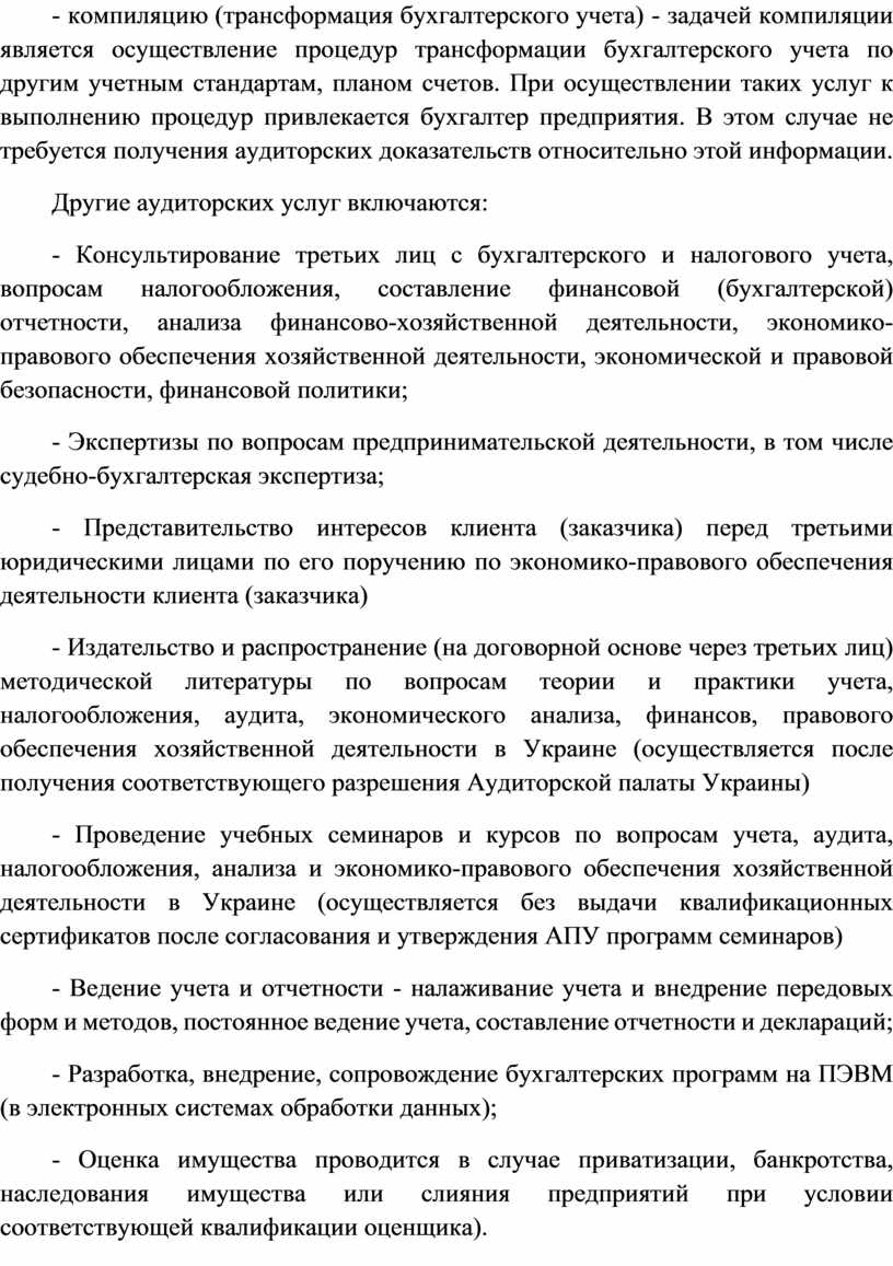 - компиляцию (трансформация бухгалтерского учета) - задачей компиляции является осуществление процедур трансформации бухгалтерского учета по другим учетным стандартам, планом счетов. При осуществлении таких услуг к выполнению процедур привлекается бухгалтер предприятия. В этом случае не требуется получения аудиторских доказательств относительно этой информации.