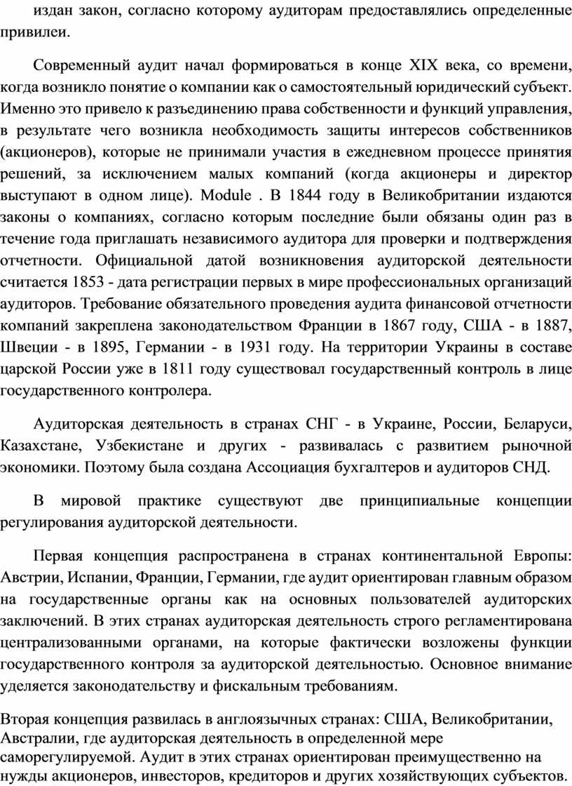 Современный аудит начал формироваться в конце XIX века, со времени, когда возникло понятие о компании как о самостоятельный юридический субъект. Именно это привело к разъединению права собственности и функций управления, в результате чего возникла необходимость защиты интересов собственников (акционеров), которые не принимали участия в ежедневном процессе принятия решений, за исключением малых компаний (когда акционеры и директор выступают в одном лице). Module . В 1844 году в Великобритании издаются законы о компаниях, согласно которым последние были обязаны один раз в течение года приглашать независимого аудитора для проверки и подтверждения отчетности. Официальной датой возникновения аудиторской деятельности считается 1853 - дата регистрации первых в мире профессиональных организаций аудиторов. Требование обязательного проведения аудита финансовой отчетности компаний закреплена законодательством Франции в 1867 году, США - в 1887, Швеции - в 1895, Германии - в 1931 году. На территории Украины в составе царской России уже в 1811 году существовал государственный контроль в лице государственного контролера.