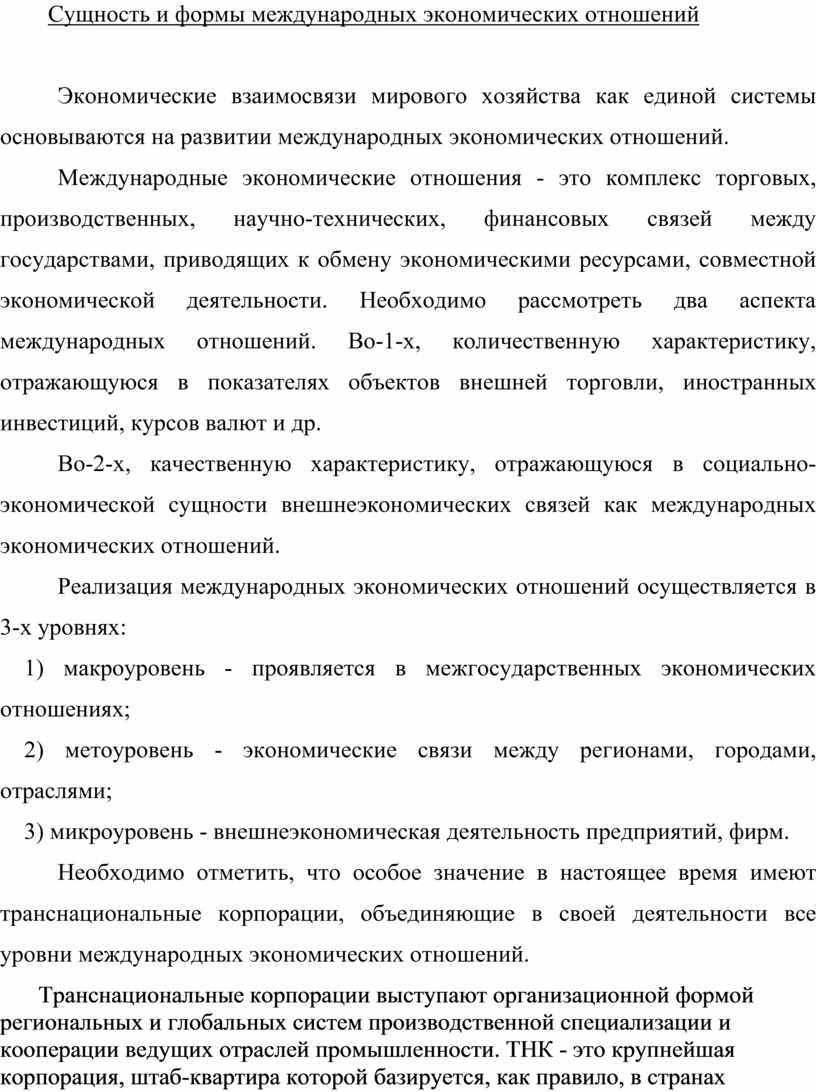 Необходимо отметить, что особое значение в настоящее время имеют транснациональные корпорации, объединяющие в своей деятельности все уровни международных экономических отношений.