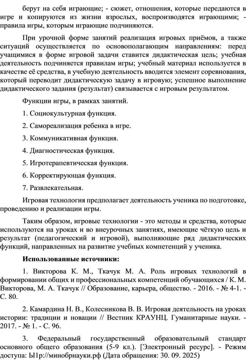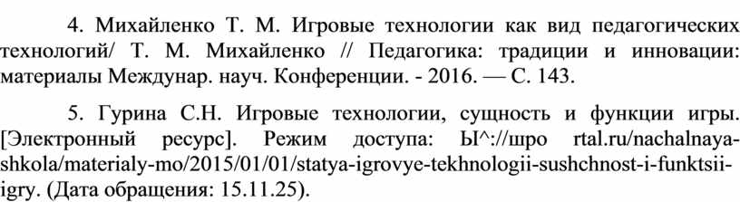 5. Гурина С.Н. Игровые технологии, сущность и функции игры. [Электронный ресурс]. Режим доступа: Ы^://шро rtal.ru/nachalnaya-shkola/materialy-mo/2015/01/01/statya-igrovye-tekhnologii-sushchnost-i-funktsii-igry. (Дата обращения: 15.11.25).